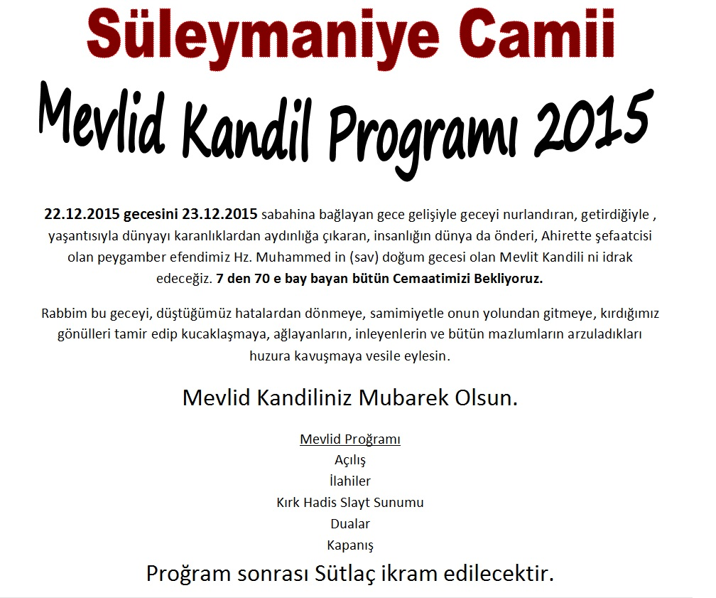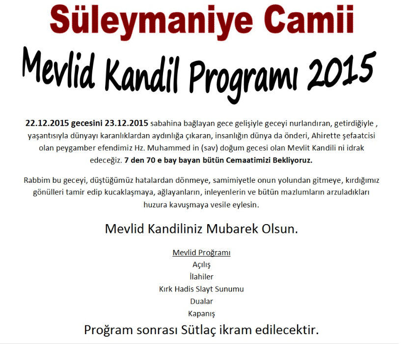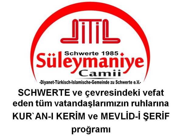 Kıymetli Schwerteliler 12.02.2017 Pazar Günü Öğlen namazına müteakip Schwerteli Vefat Edenler için Camiimizde Mevlit-i Şerif okutulacaktır. Bütün Cemaatimiz davetlidir...