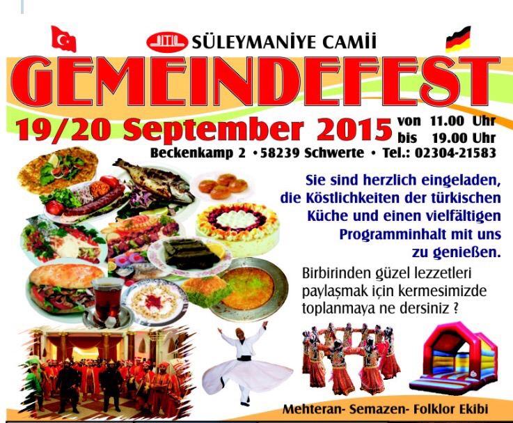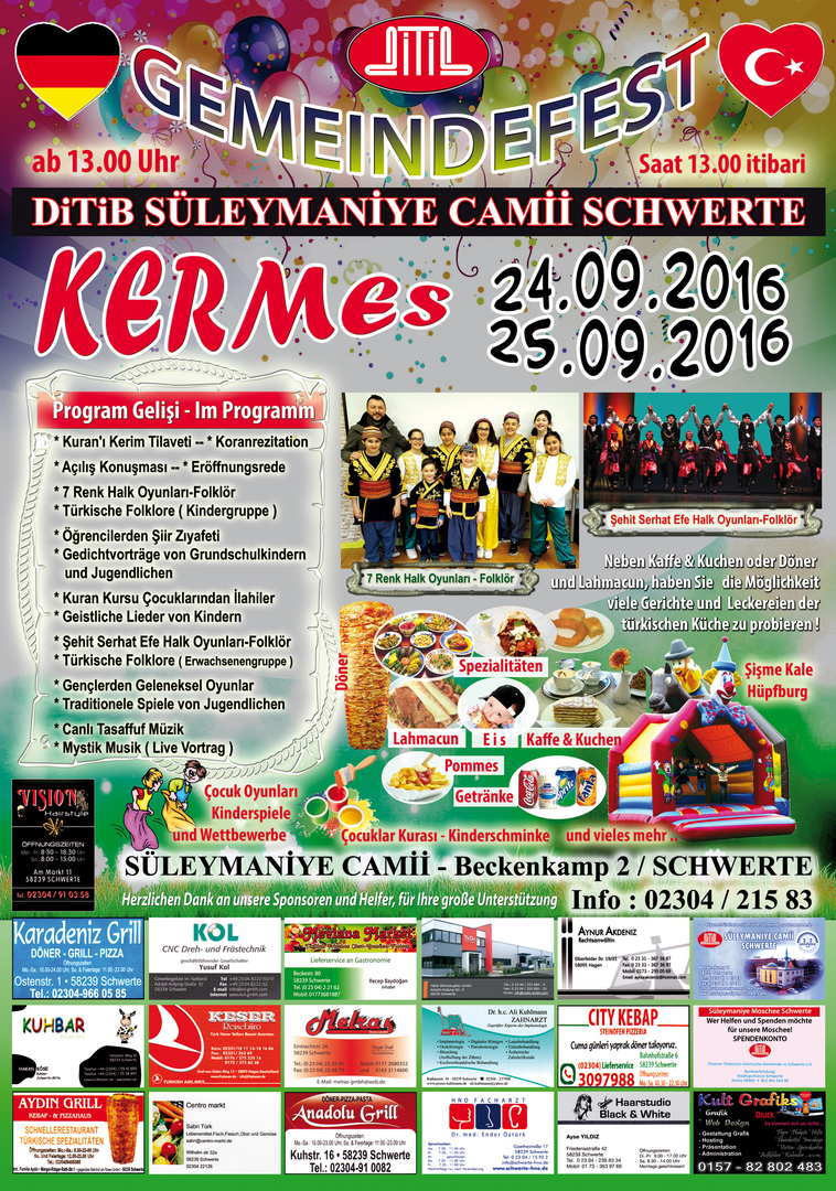Kıymetli Schwerteliler, 24 - 25 Eylül 2016 tarihinde yani bu hafta sonu Camimizin yararına Süleymaniye Ditib Camii'nde saat 13.00 dan sonra KERMES "GEMEINDEFEST"