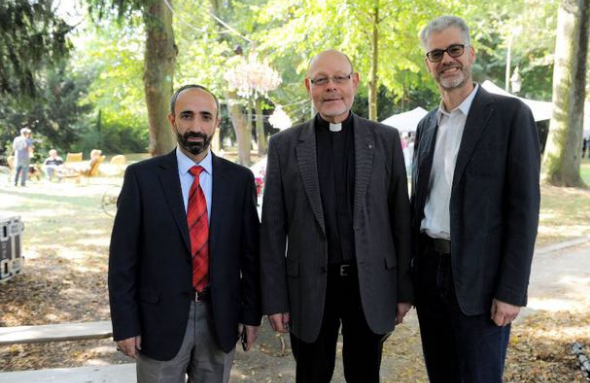 Friedensgebet für Flüchtlinge aracılığıyla bir araza gelen Camiimiz imamı Hüseyin Bektaş, Katolik Klisesinden Pastor Ivan ve Pastor Dam.