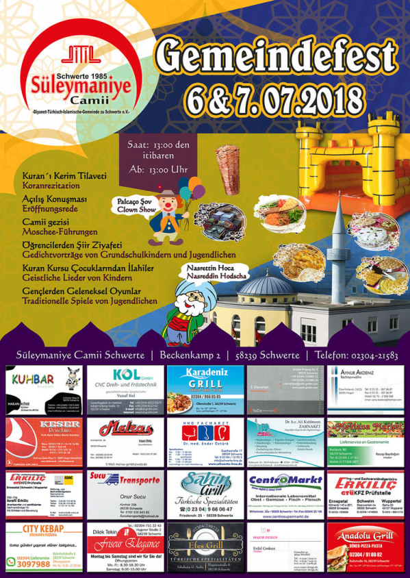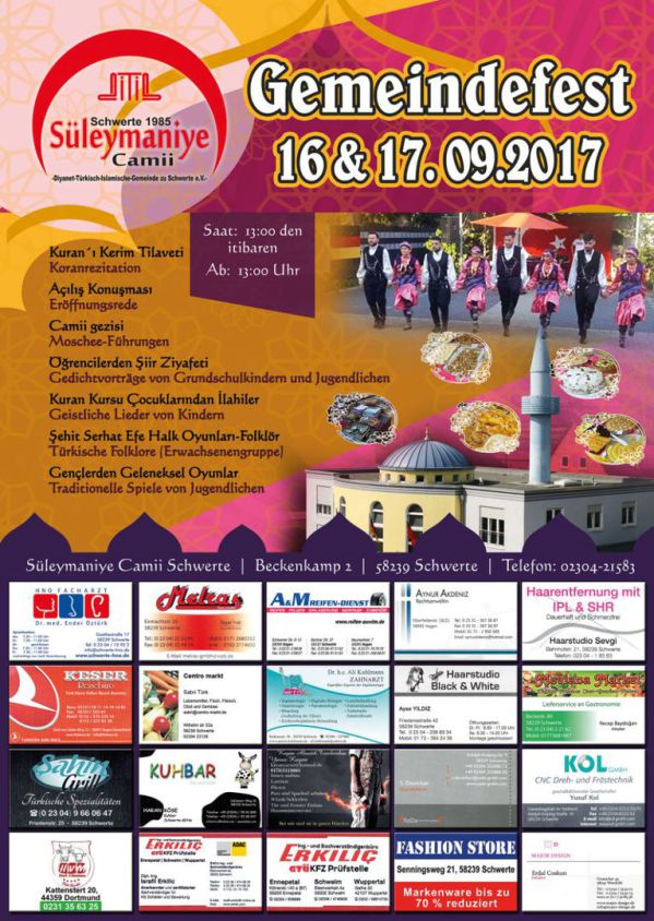 Kıymetli Schwerteliler, 16 - 17 Eylül 2017 tarihinde yani bu hafta sonu Camimizin yararına Süleymaniye Ditib Camii'nde saat 13.00 dan sonra KERMES "GEMEINDEFEST"