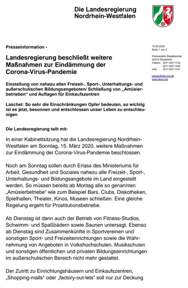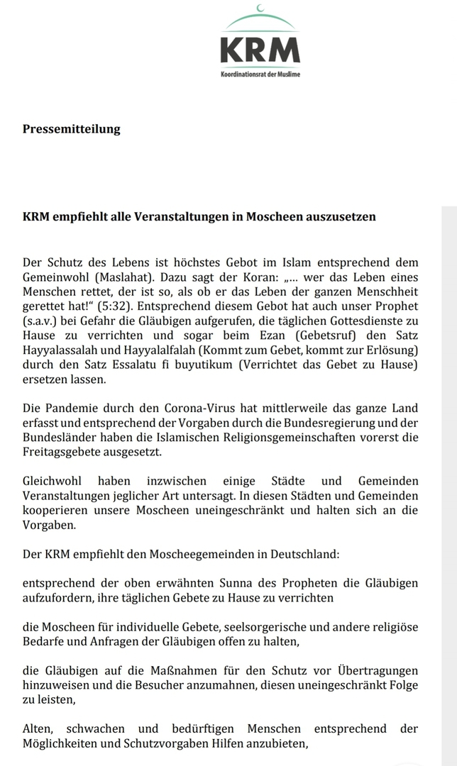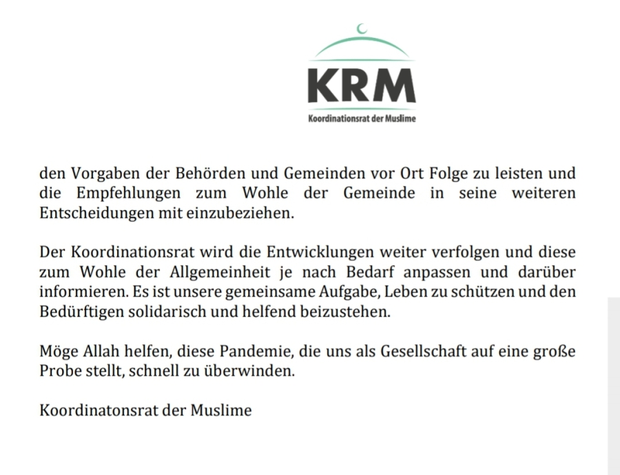 Vakit Namazları Cemaatle Kılınmayacak. Çin’de ortaya çıktıktan kısa bir süre sonra bütün dünyayı etkisi altına alan Koronavirüsüsalgınının yeni merkez üssünün Avrupa kıtası olduğu Dünya Sağlık Örgütü tarafından açıklanmışbulunmaktadır. Salgının direkt toplumumuzu tehdit edecek bir boyut kazanması, Federal Hükümet ve yerelotoritelerin tavsiye ve telkinleri ile gelişen şartlar ve ihtiyaçlar doğrultusunda, yeni bir takımtedbirlerin daha alınması zaruretini doğurmuştur. Bu bağlamda, Teşlilatımıza bağlı camilerimizde, bugünden itibaren ikinci bir duyuruya kadar,vakit namazlarının cemaatle kalınmamasının uygun olacağı mülahaza edilmiştir. Bununlabirlikte bu süreçte şimdilik, gerekli hijyen ve dezenfeksiyon şartları yerine getirilmesi kaydıyla,camilerimiz bireysel ibadete açık tutulacaktır. Küresel afet halini alan salgından insanlık ailesinin bir an önce halas bulması niyazıyla, işbumülahaza kamuoyuna ve cemaatimize saygıyla duyurulur.