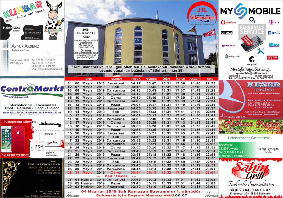 06.05.2019 Pazartesi günü itibariyle Mübarek Ramazan Ayı başlamaktadır. Sizlerin katkılarıyla her sene düzenlediğimiz, Schwerte genelindeki hem kendi cemaatimiz hem de mülteci kardeşlerimiz için